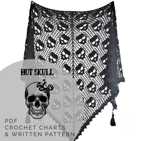 HOT SKULL is a crochet pattern for a skull-motif shawl. The pattern includes: